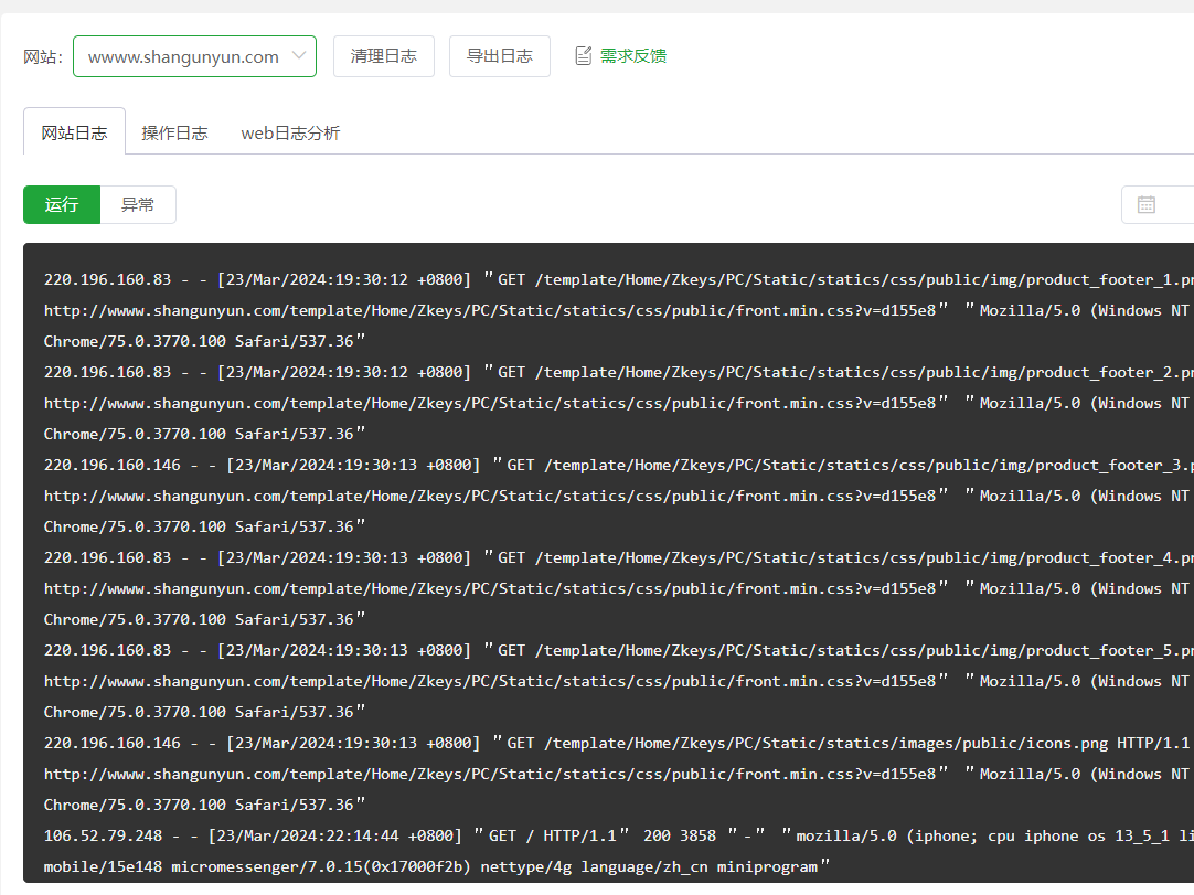 这个功能对于日志分析,IP采集,攻击分析非常有用,我遇到很多次服务器资源占满,都是用这个方法找到访问过多的IP,然后把IP禁用掉,马上资源占用就掉下来了。