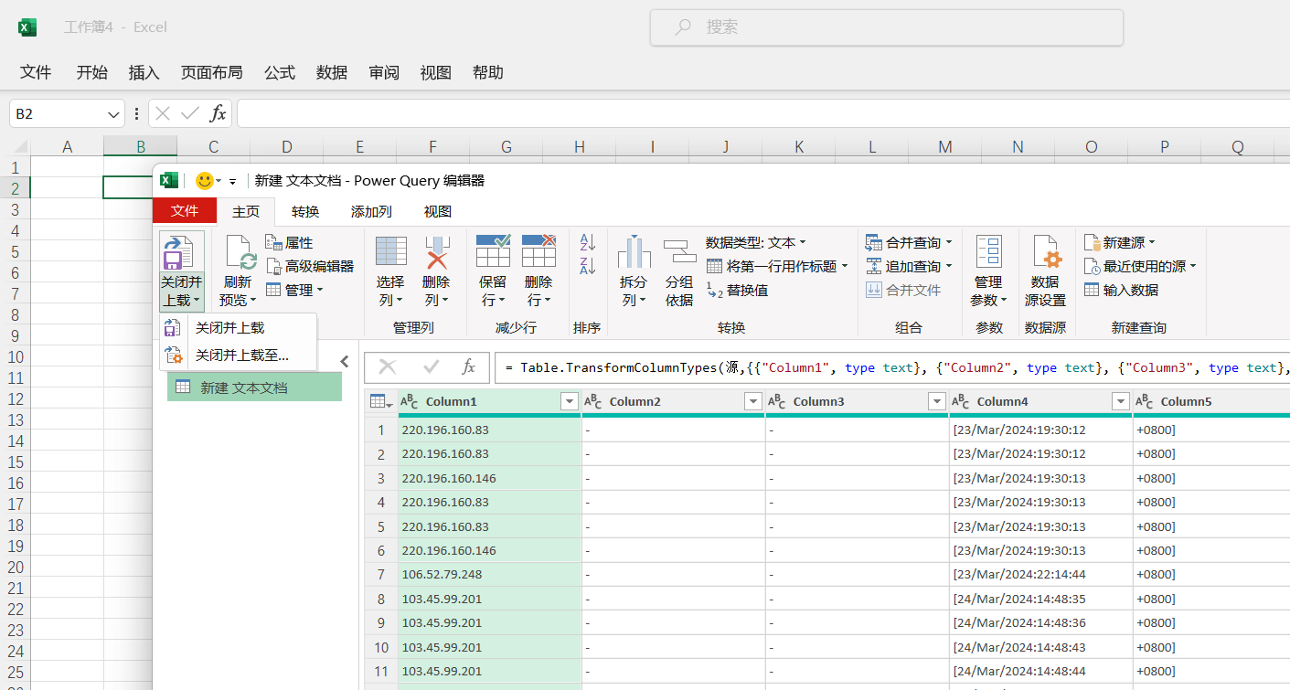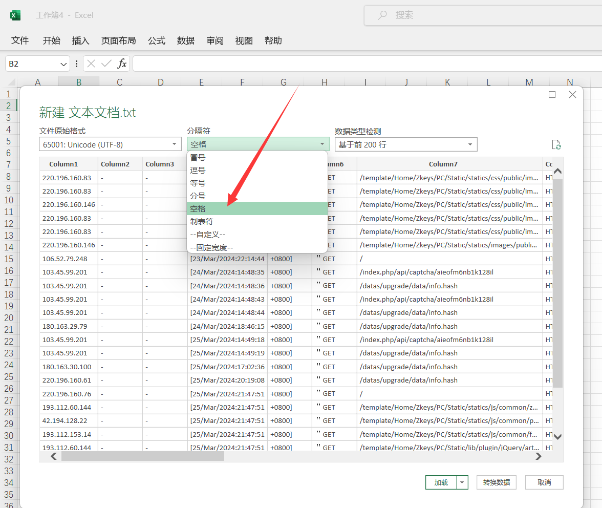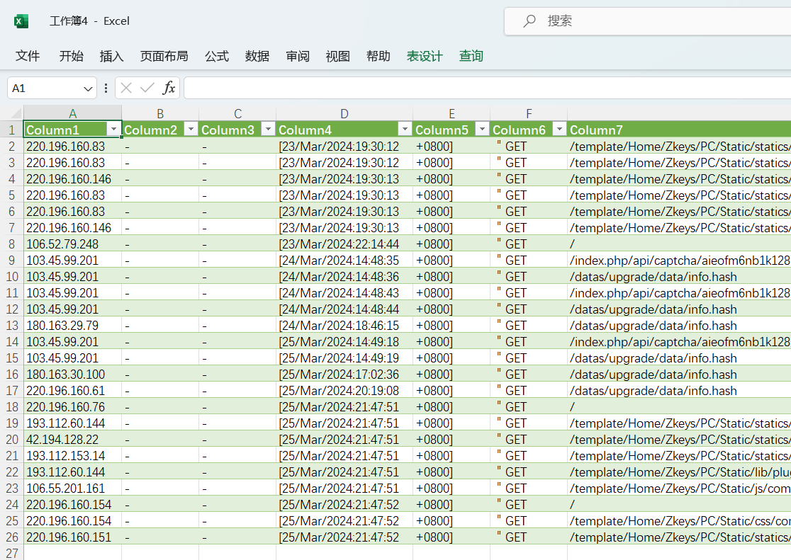 5、导入成功,我导入的是网站日志,会把ip、日期时间、时区、日志内容等全部清晰的展示在表格里面。