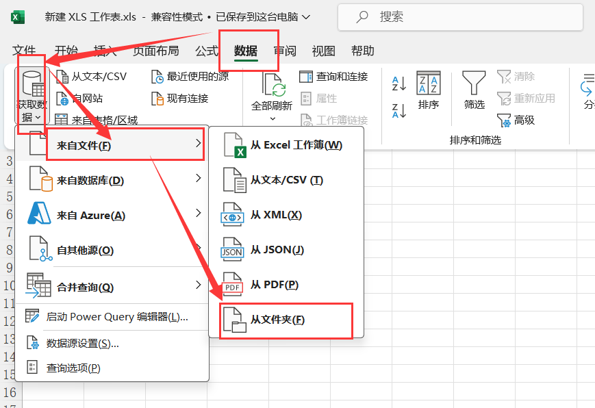 1、打开excel,点击数据,获取数据,来自文件,从文件夹,